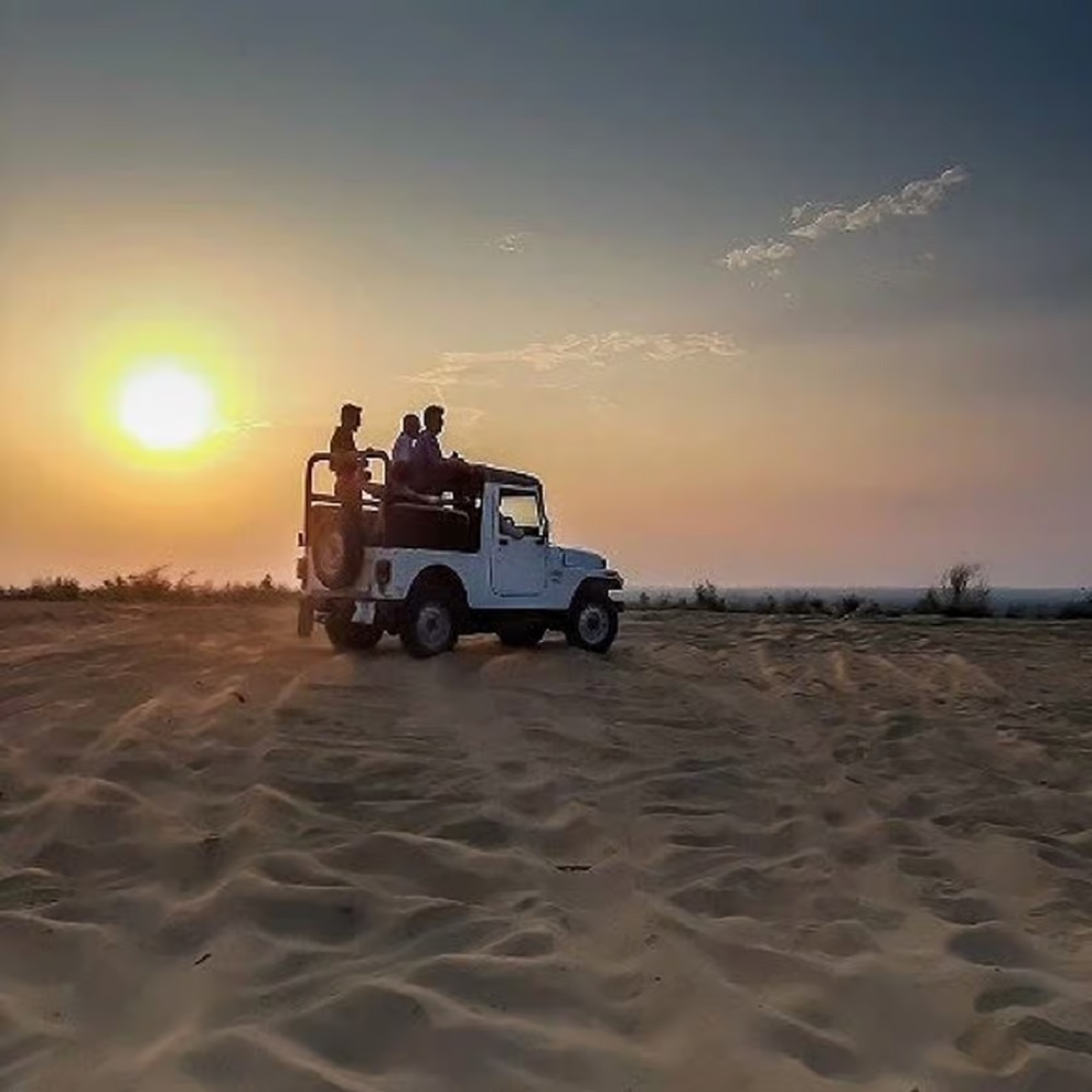 The jeep safari Jaisalmer ends with a beautiful sunset over the sand dunes, a perfect way to conclude your adventure. The changing colours of the sky and the peaceful atmosphere make this moment truly special.